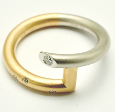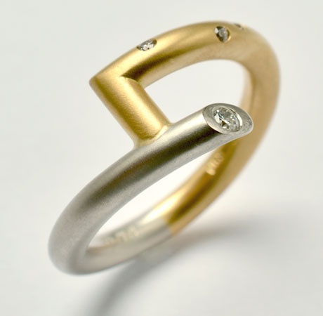 Das runde Profil umspielt elegant den Finger. In die abgeschrägten Enden ist je ein Brillant eingeschlossen.