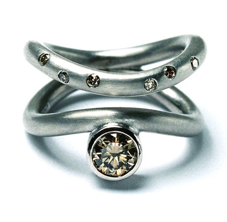 Zwei Ringformen verbinden sich zu einer neuen Räumlichkeit. Leicht und beschwingt begegnen sich zwei Ringe und schaffen durch Distanz und Nähe ein spannungsvolles Gegenüber. Ihre offene harmonische Form und der besondere Einsatz von Diamanten geben ihnen einen unverwechselbaren Charakter und besonderen Tragekomfort.